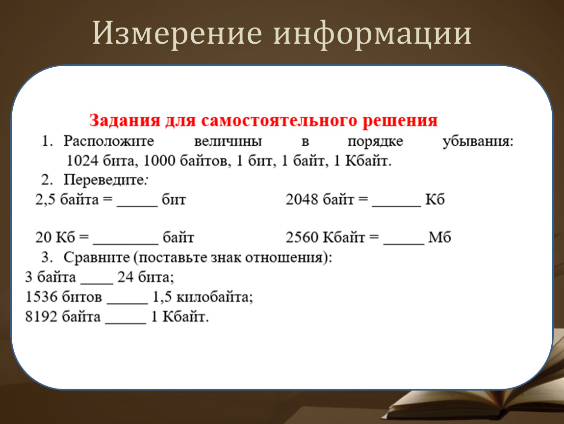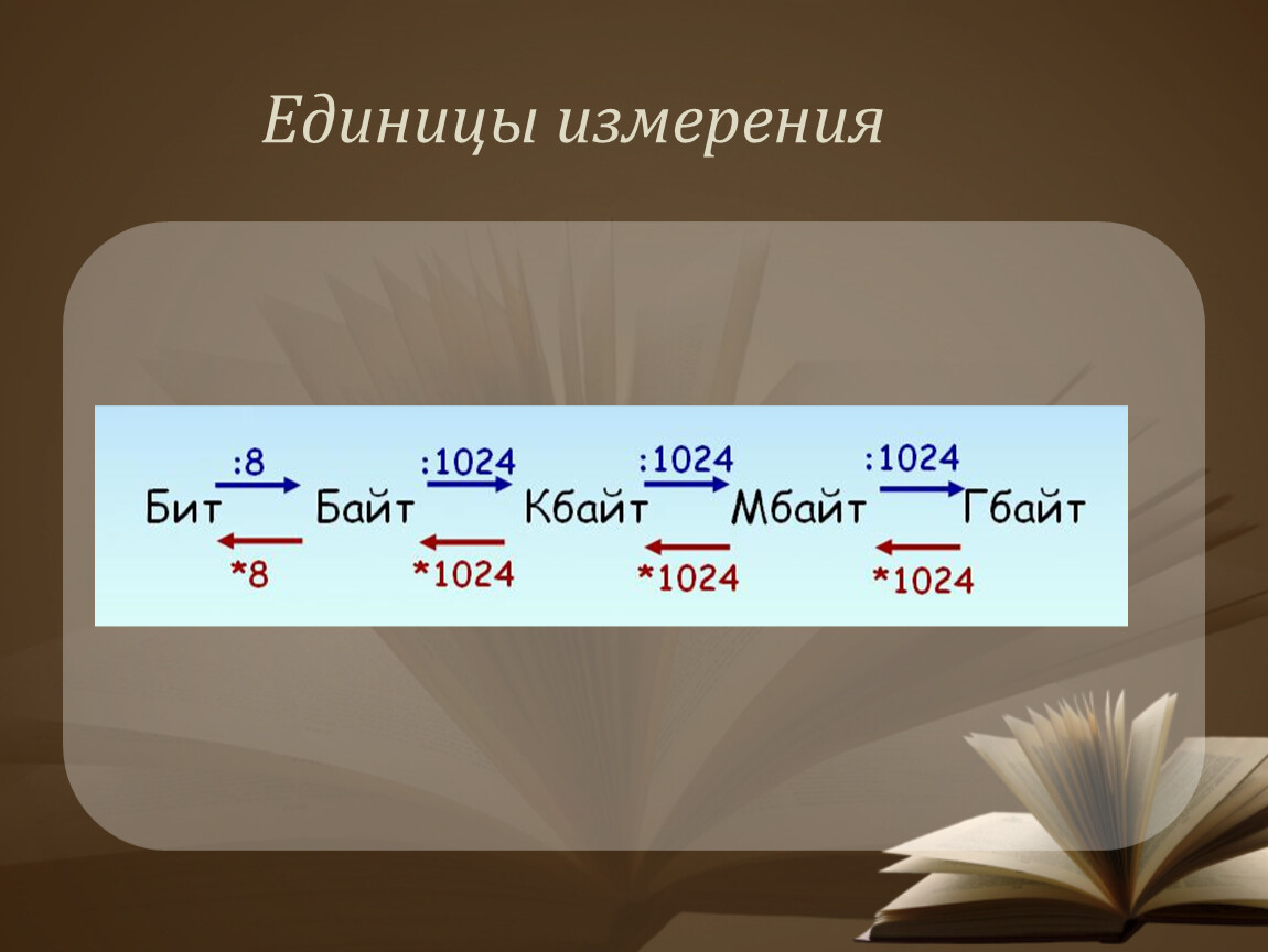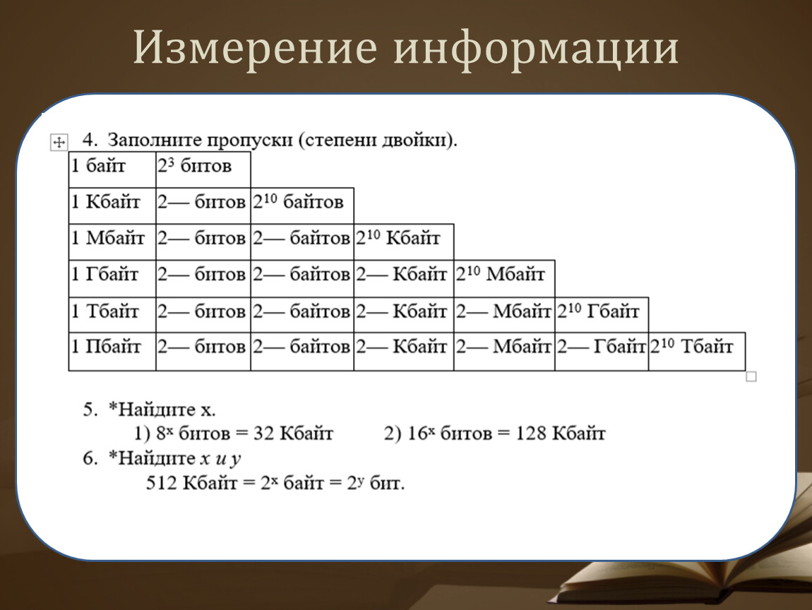 | 5 Гбайт = ? Кбайт = ? бит; 512 Кбайт = 2? байт = 2? бит; |