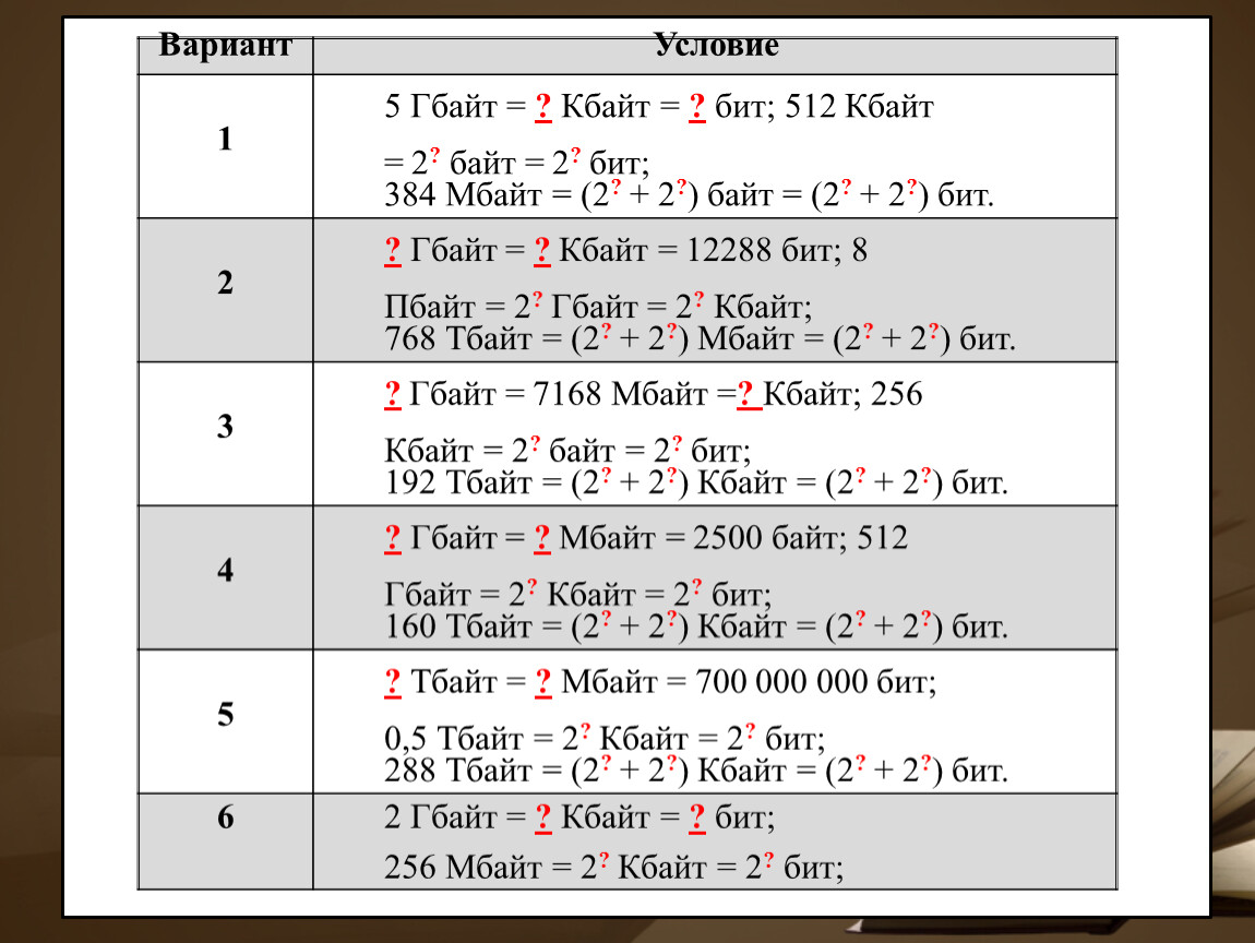 | ? Гбайт = 7168 Мбайт =? Кбайт; 256 Кбайт = 2? байт = 2? бит; |
