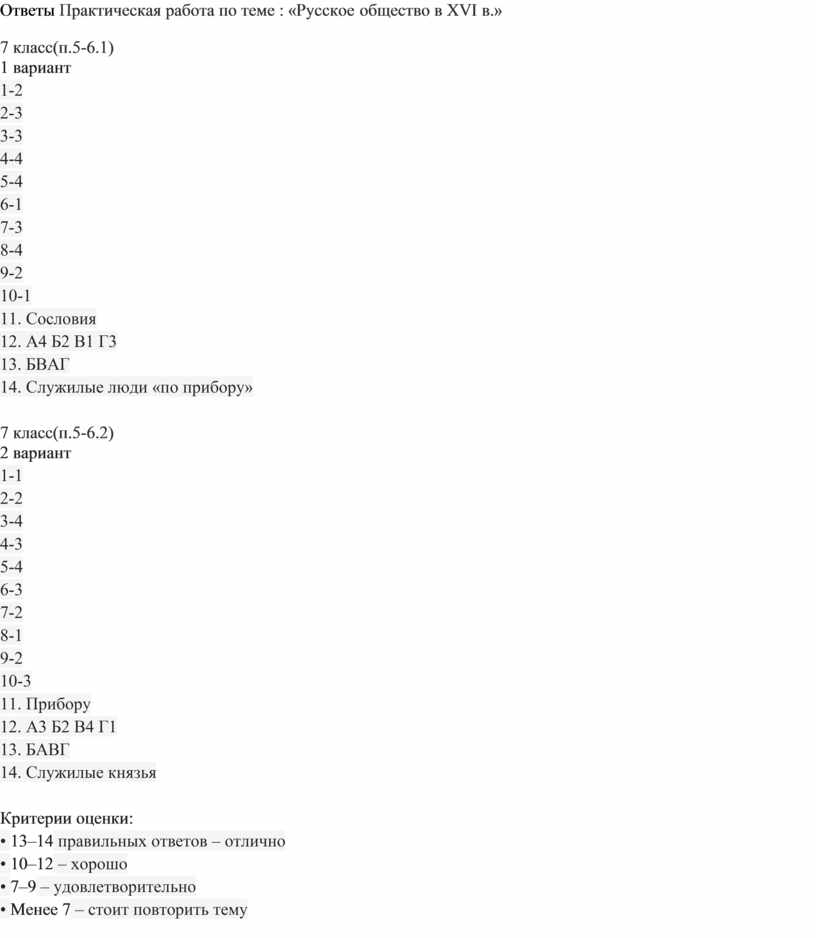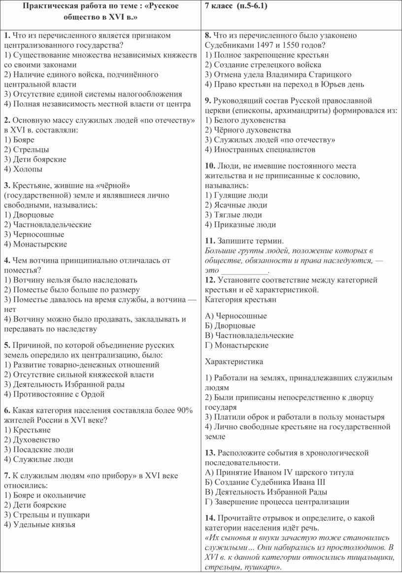 Ответы Практическая работа по теме : «Русское общество в XVI в.»