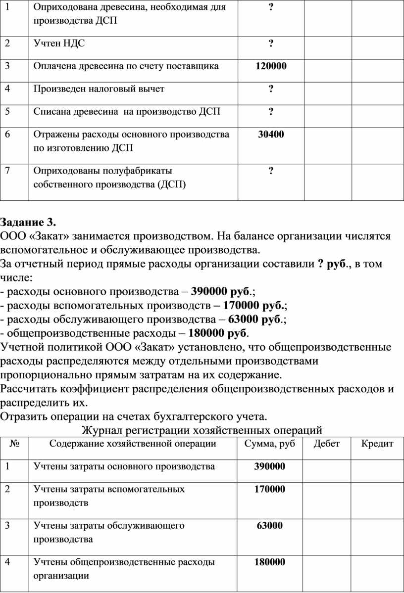 Цель: закрепить теоретические знания по теме, получить практические навыки по составлению бухгалтерских проводок, определению себестоимости готовой продукции, полуфабрикатов собственного производства, распределению общепроизводственных расходов.