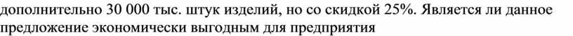 Производственные мощности предприятия рассчитаны на 160 000 тыс. штук изделий в год. Объем заказов упал на 30%. Рыночная цена единицы това- ра составляет 1 800 руб. Постоянные расходы предприятия – 72 млн руб. Пере- менные затраты на единицу продукции 1 200 руб. Один из заказчиков предла- гает приобрести дополнительно 30 000 тыс. штук изделий, но со скидкой 25%. Является ли данное предложение экономически выгодным для предприятия