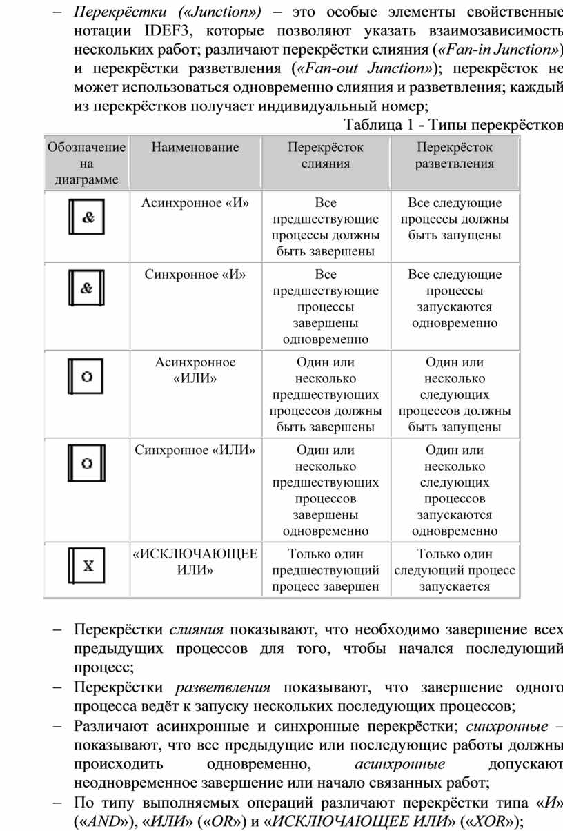 - Перекрёстки («Junction») – это особые элементы свойственные нотации IDEF3, которые позволяют указать взаимозависимость нескольких работ; различают перекрёстки слияния («Fan-in Junction») и перекрёстки разветвления («Fan-out Junction»); перекрёсток не может использоваться одновременно слияния и разветвления; каждый из перекрёстков получает индивидуальный номер;