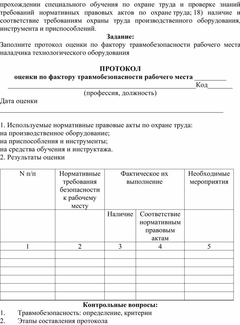 Цель: формирование умений составления протокола оценки по фактору травмобезопасности рабочего места наладчика технологического оборудования