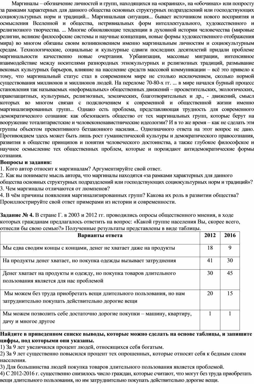 Задание № 4. В стране Г. в 2003 и 2012 гг. проводились опросы общественного мнения, в ходе которых гражданам предлагалось ответить на вопрос: «Какой группе населения Вы, скорее всего, отнесли бы свою семью?» Полученные результаты представлены в виде таблицы.