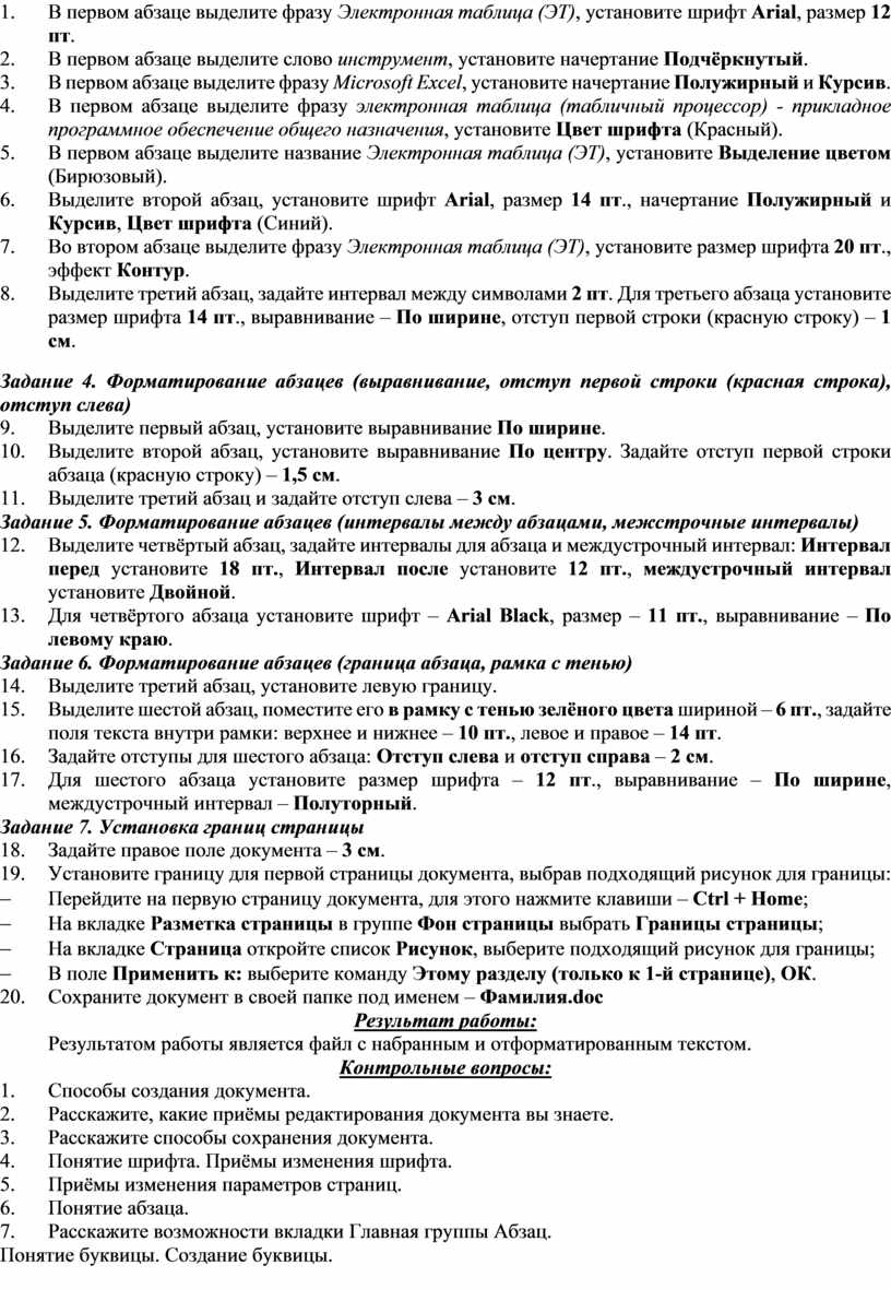7. В первом абзаце выделите фразу Электронная таблица (ЭТ), установите шрифт Arial, размер 12 пт.
