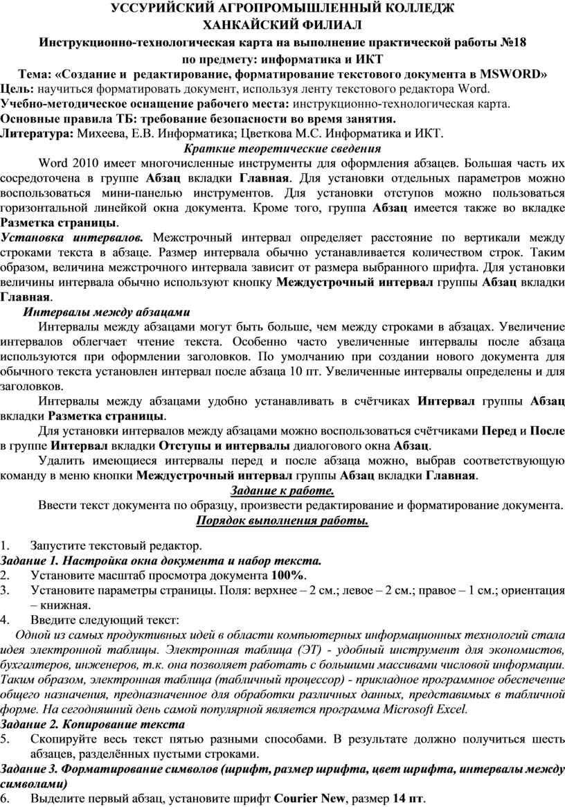 Инструкционно-технологическая карта на выполнение практической работы №18