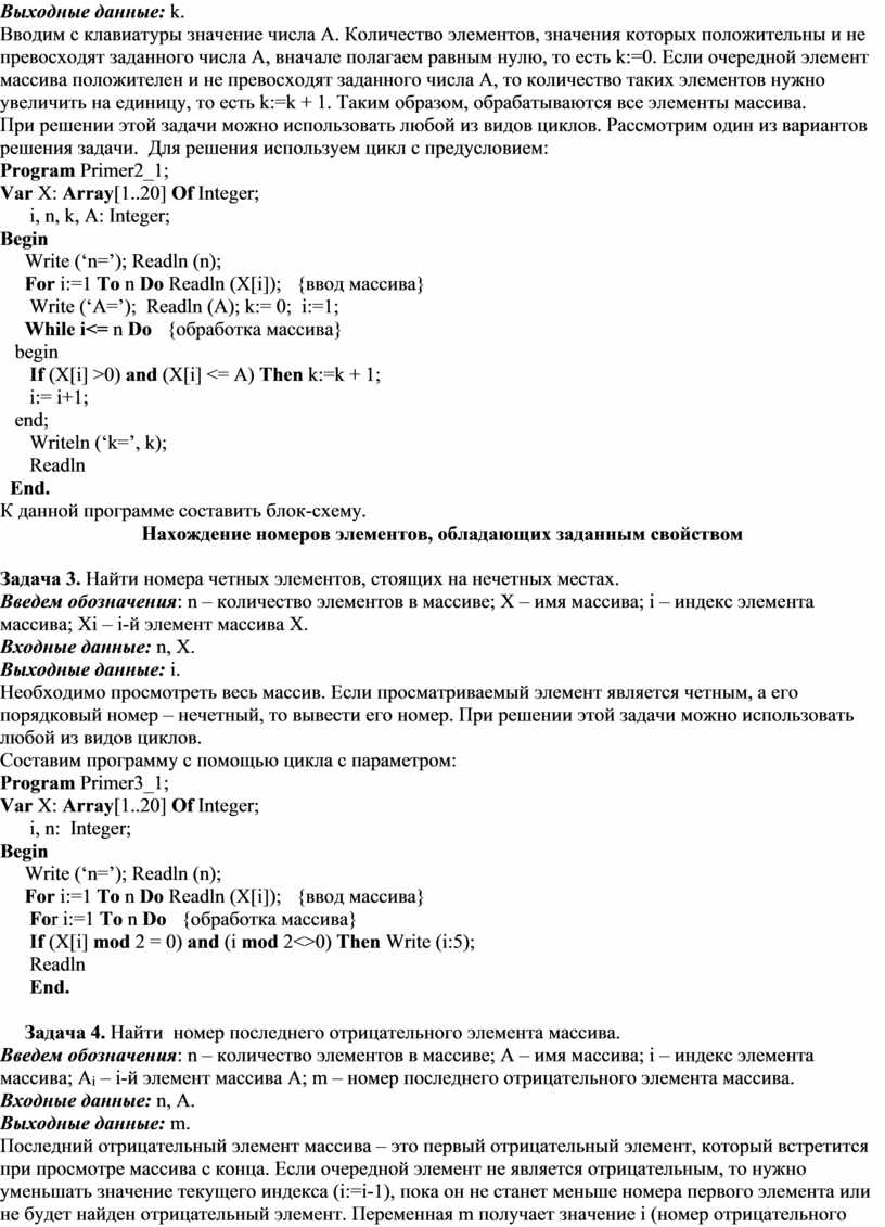 Вводим с клавиатуры значение числа А. Количество элементов, значения которых положительны и не превосходят заданного числа А, вначале полагаем равным нулю, то есть k:=0. Если очередной элемент массива положителен и не превосходят заданного числа A, то количество таких элементов нужно увеличить на единицу, то есть k:=k + 1. Таким образом, обрабатываются все элементы массива.