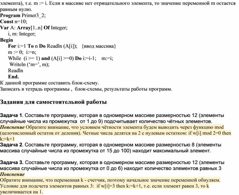 Последний отрицательный элемент массива – это первый отрицательный элемент, который встретится при просмотре массива с конца. Если очередной элемент не является отрицательным, то нужно уменьшать значение текущего индекса (i:=i-1), пока он не станет меньше номера первого элемента или не будет найден отрицательный элемент. Переменная m получает значение i (номер отрицательного элемента), т.е. m := i. Если в массиве нет отрицательного элемента, то значение переменной m остается равным нулю.