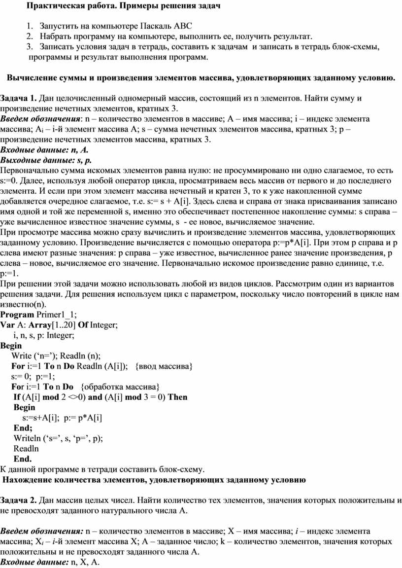 При просмотре массива можно сразу вычислить и произведение элементов массива, удовлетворяющих заданному условию. Произведение вычисляется с помощью оператора p:=p*A[i]. При этом p справа и p слева имеют разные значения: p справа – уже известное, вычисленное ранее значение произведения, p слева – новое, вычисляемое его значение. Первоначально искомое произведение равно единице, т.е. p:=1.