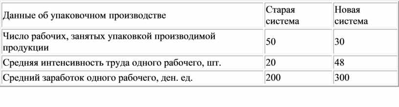 Определите, как изменится число занятых работников, интенсивность труда, средний заработок рабочего и расход предпринимателя на упаковку одного изделия, если произойдет замена старой системы организации труда на новую (исходные данные приведены в таблице).