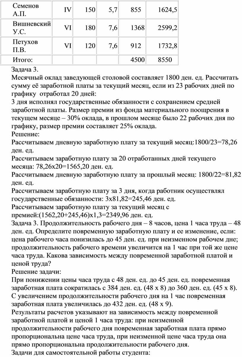 Задача 3. Продолжительность рабочего дня – 8 часов, цена 1 часа труда – 48 ден. ед. Определите повременную заработную плату и ее изменение, если: цена рабочего часа понизилась до 45 ден. ед. при неизменном рабочем дне; продолжительность рабочего времени увеличится на 1 час при той же цене часа труда. Какова зависимость между повременной заработной платой и ценой труда?