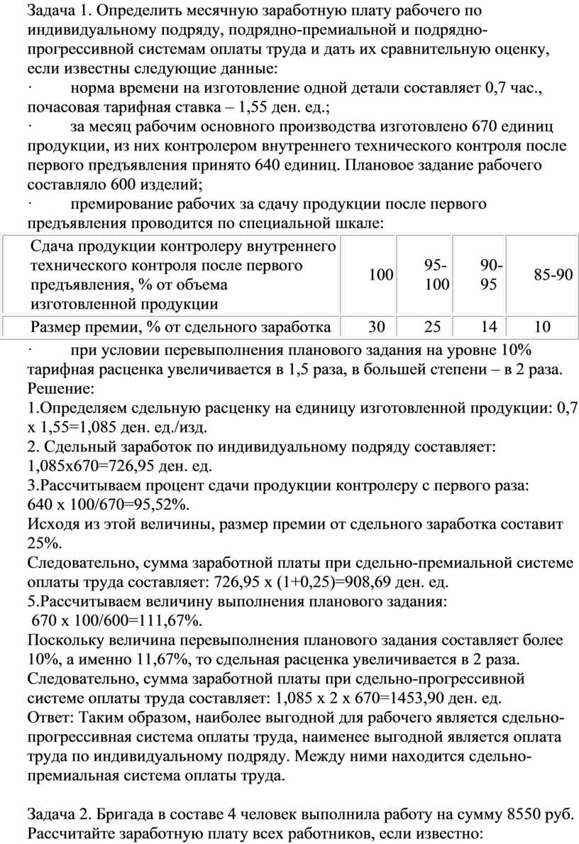 Задача 1. Определить месячную заработную плату рабочего по индивидуальному подряду, подрядно-премиальной и подрядно-прогрессивной системам оплаты труда и дать их сравнительную оценку, если известны следующие данные:
