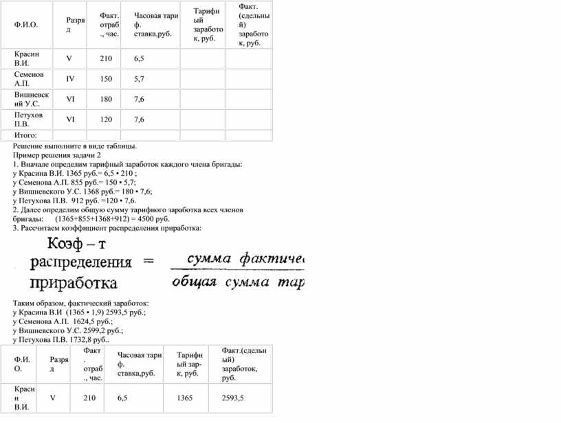 Задача 2. Бригада в составе 4 человек выполнила работу на сумму 8550 руб. Рассчитайте заработную плату всех работников, если известно: