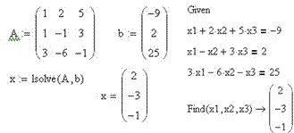 Пример 3. Решить систему с помощью функции lsolve и при помощи решающего блока: х1 + 2х2 + 5х3 = −9