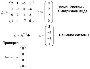 Решение системы при помощи функции lsolve показано на рис. 3. Фрагмент рабочего документа на рис.3 содержит пример применения решающего блока для решения системы.