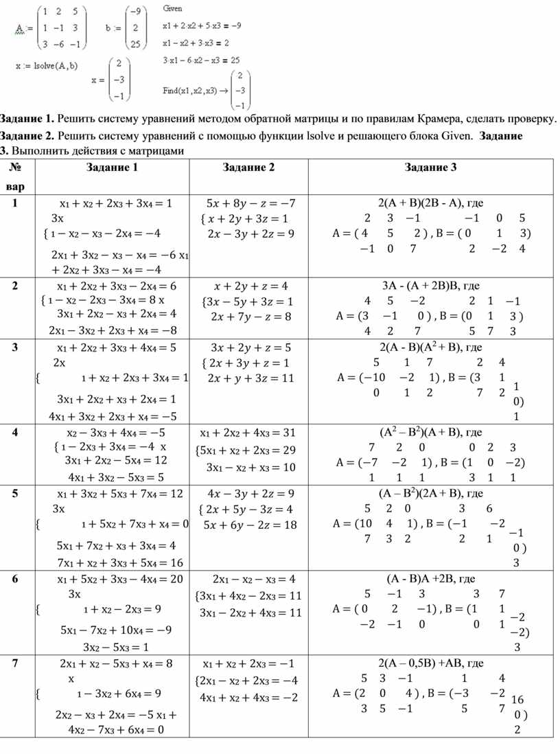 Задание 2. Решить систему уравнений с помощью функции lsolve и решающего блока Given. Задание 3. Выполнить действия с матрицами