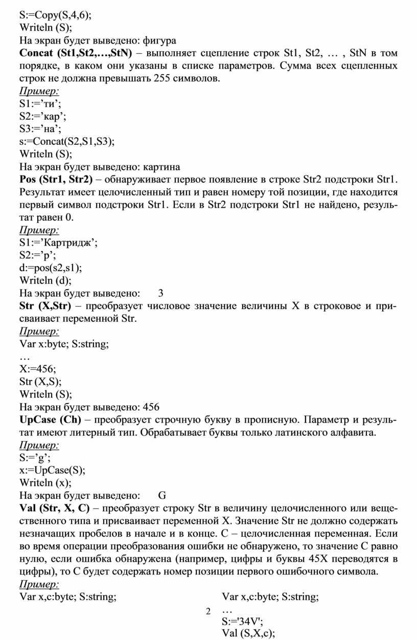 Val (Str, X, С) – преобразует строку Str в величину целочисленного или веще- ственного типа и присваивает переменной Х. Значение Str не должно содержать незначащих пробелов в начале и в конце. С – целочисленная переменная. Если во время операции преобразования ошибки не обнаружено, то значение С равно нулю, если ошибка обнаружена (например, цифры и буквы 45X переводятся в цифры), то С будет содержать номер позиции первого ошибочного символа.
