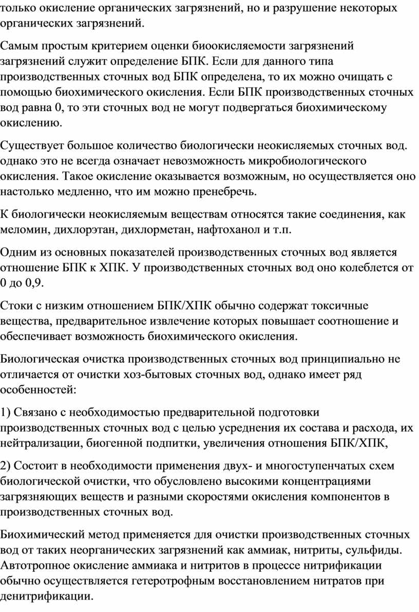 Самым простым критерием оценки биоокисляемости загрязнений загрязнений служит определение БПК. Если для данного типа производственных сточных вод БПК определена, то их можно очищать с помощью биохимического окисления. Если БПК производственных сточных вод равна 0, то эти сточных вод не могут подвергаться биохимическому окислению.