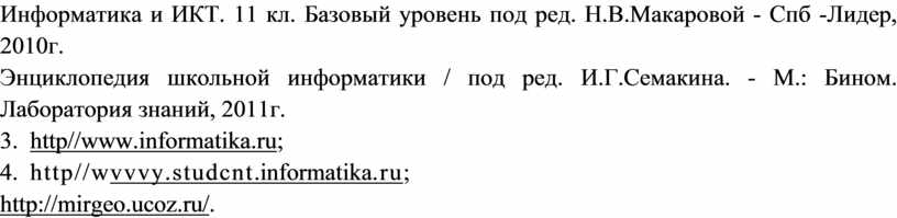 6. Информатика и ИКТ. 11 кл. Базовый уровень под ред. Н.В.Макаровой - Спб -Лидер, 2010г.