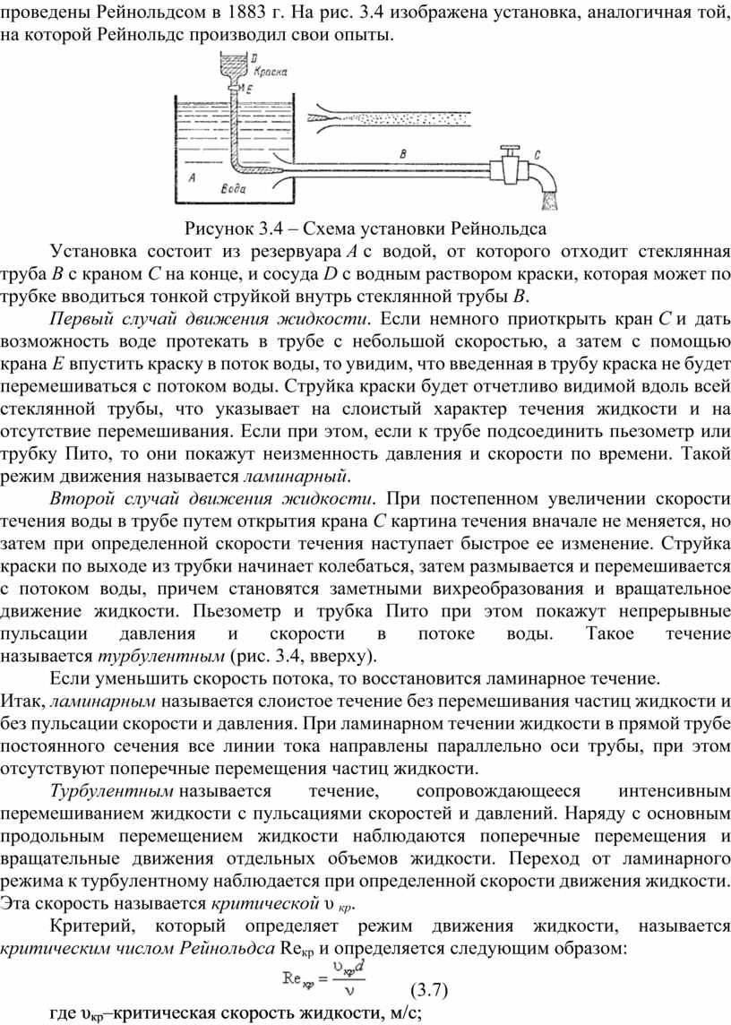 При наблюдении за движением жидкости в трубах и каналах, можно заметить, что в одном случае жидкость сохраняет определенный строй своих частиц, а в других - перемещаются бессистемно. Однако исчерпывающие опыты по этому вопросу были проведены Рейнольдсом в 1883 г. На рис. 3.4 изображена установка, аналогичная той, на которой Рейнольдс производил свои опыты.