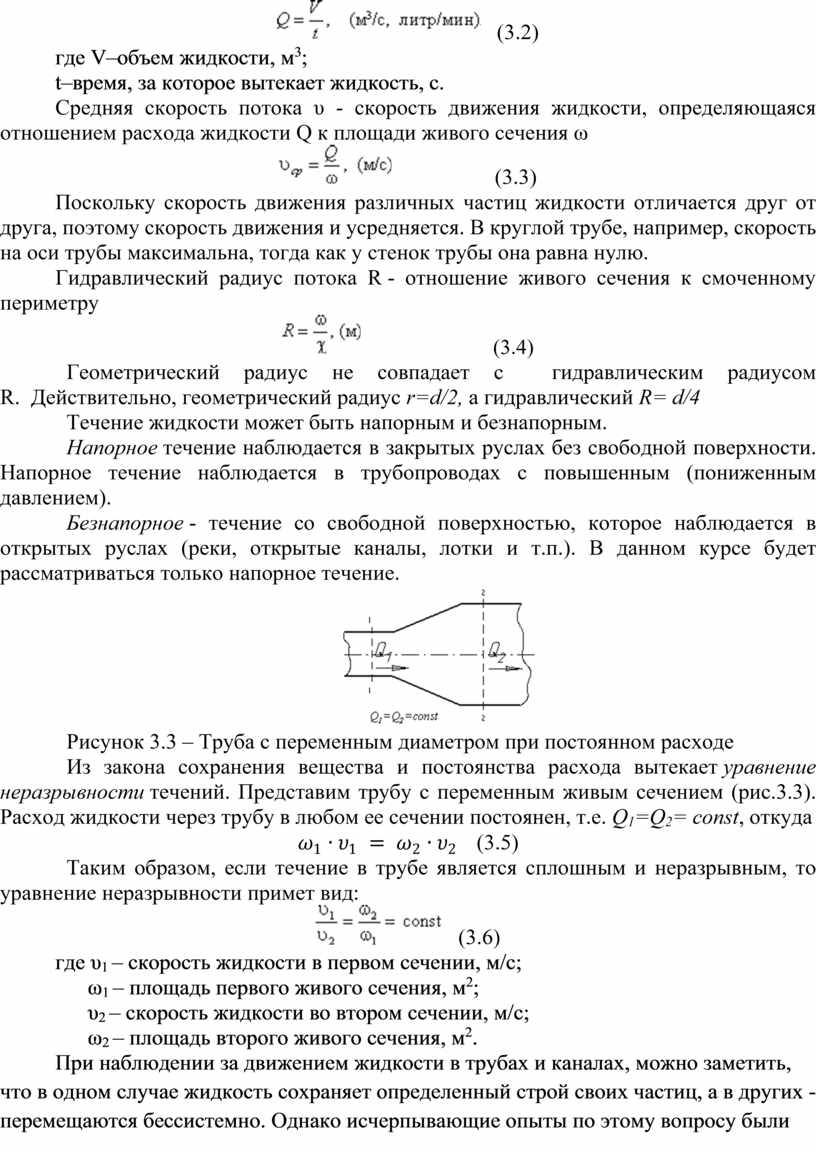 Из закона сохранения вещества и постоянства расхода вытекает уравнение неразрывности течений. Представим трубу с переменным живым сечением (рис.3.3). Расход жидкости через трубу в любом ее сечении постоянен, т.е. Q1=Q2= const, откуда