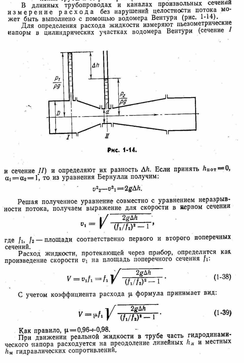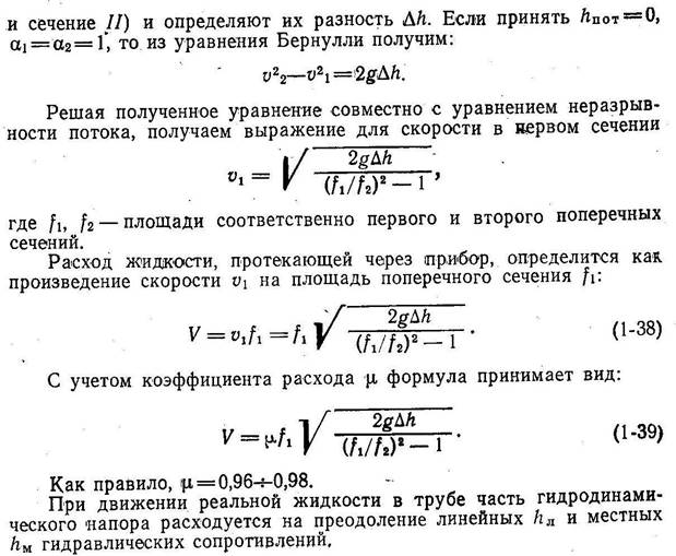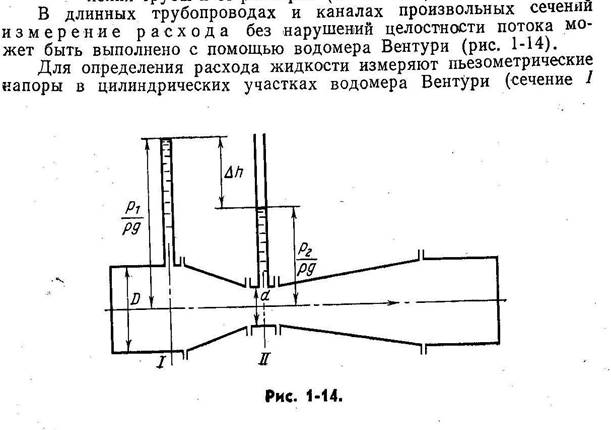 3. Определить расход воды, если разность пьезометрических напоров в большом и малом сечениях водомерной трубы Dh = 250 мм, диаметр большого сечения D = 200 мм, диаметр малого сечения d = 100 мм. Коэффициент расхода m= 0,98 (Ерохин 1-50, стр. 31).