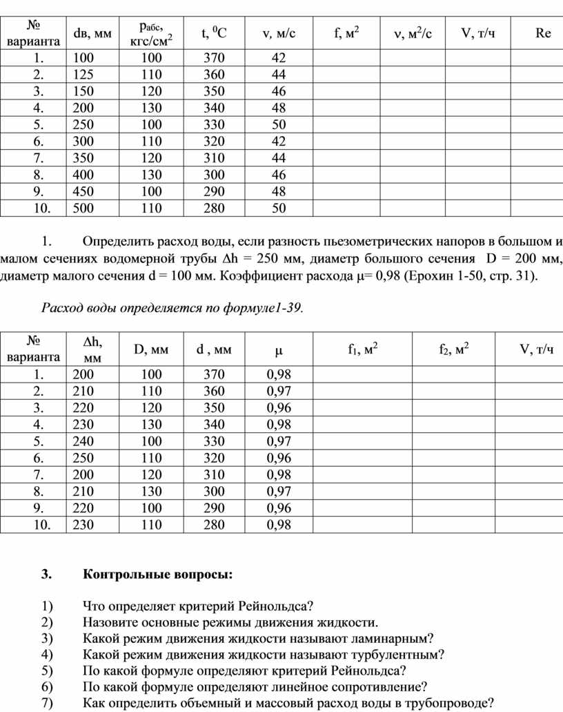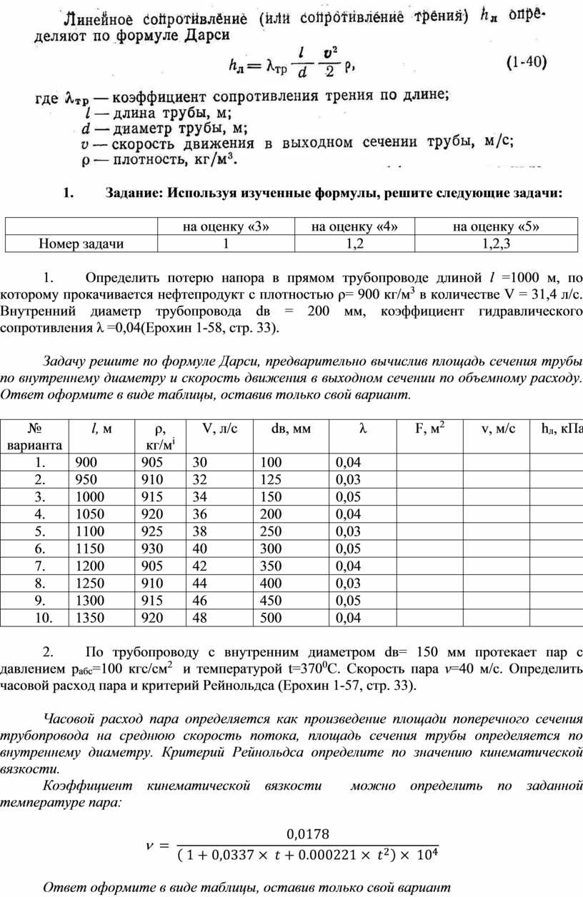 Задачу решите по формуле Дарси, предварительно вычислив площадь сечения трубы по внутреннему диаметру и скорость движения в выходном сечении по объемному расходу. Ответ оформите в виде таблицы, оставив только свой вариант.