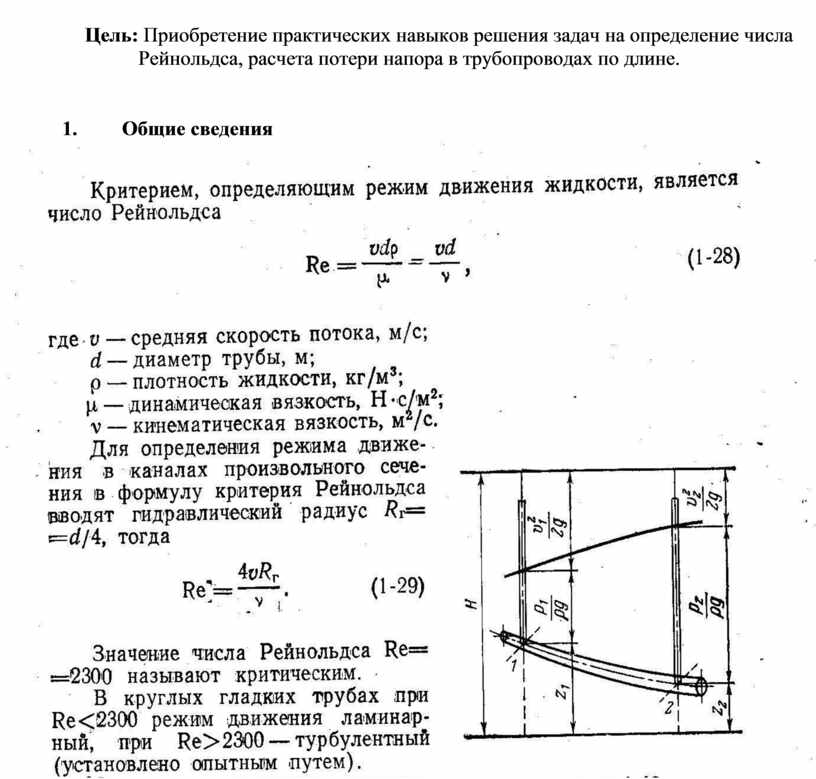 Цель: Приобретение практических навыков решения задач на определение числа Рейнольдса, расчета потери напора в трубопроводах по длине.