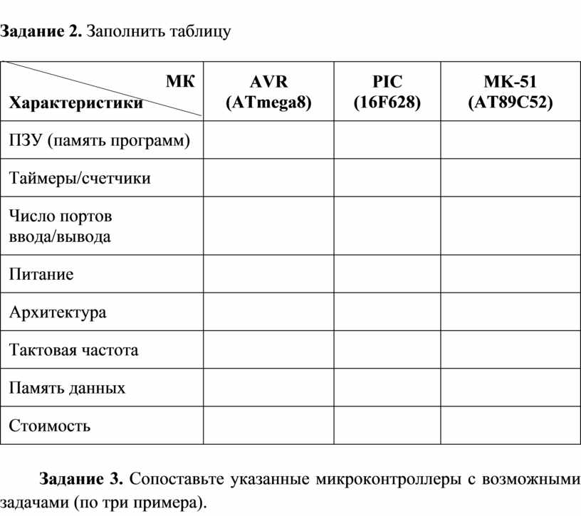 Задание 3. Сопоставьте указанные микроконтроллеры с возможными задачами (по три примера).