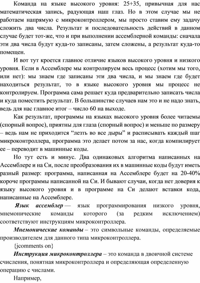 Команда на языке высокого уровня: 25+35, привычная для нас математическая запись, радующая наш глаз. Но в этом случае мы не работаем напрямую с микроконтроллером, мы просто ставим ему задачу сложить два числа. Результат и последовательность действий в данном случае будет тот-же, что и при выполнении ассемблерной команды: сначала эти два числа будут куда-то записаны, затем сложены, а результат куда-то помещен.