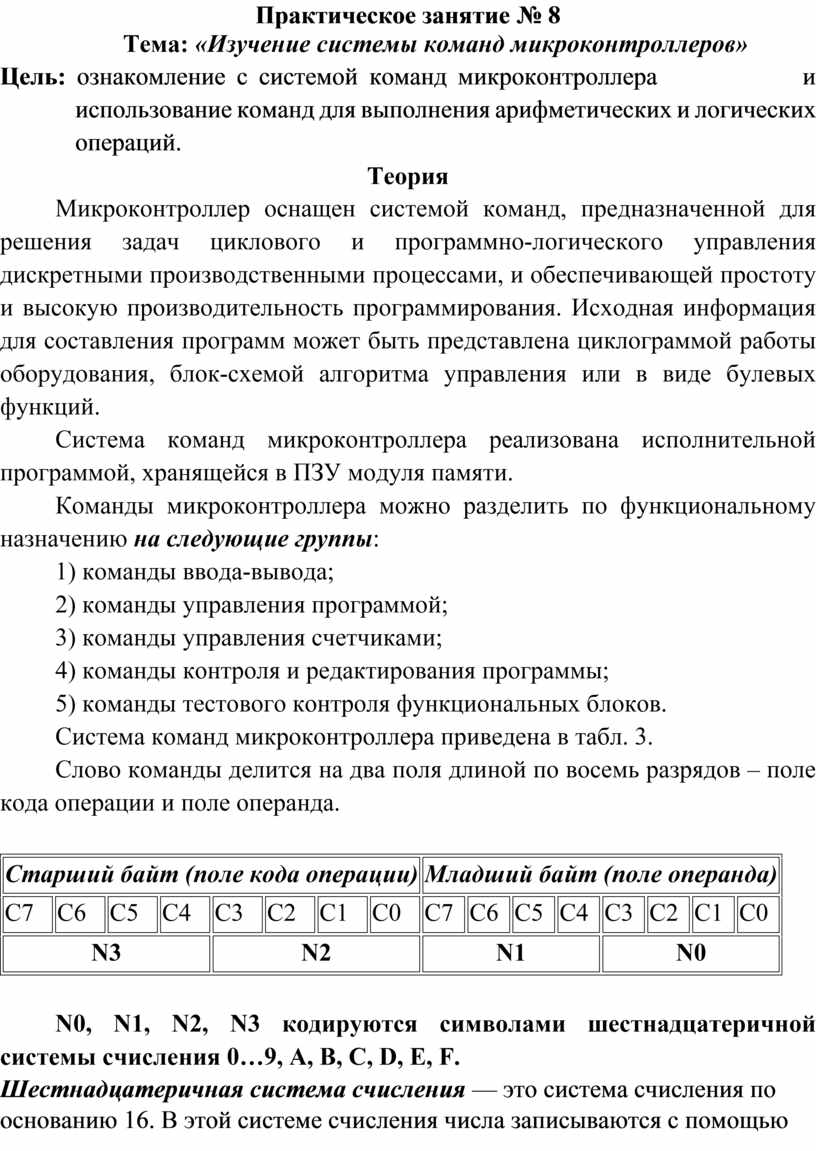 Цель: ознакомление с системой команд микроконтроллера и использование команд для выполнения арифметических и логических операций.