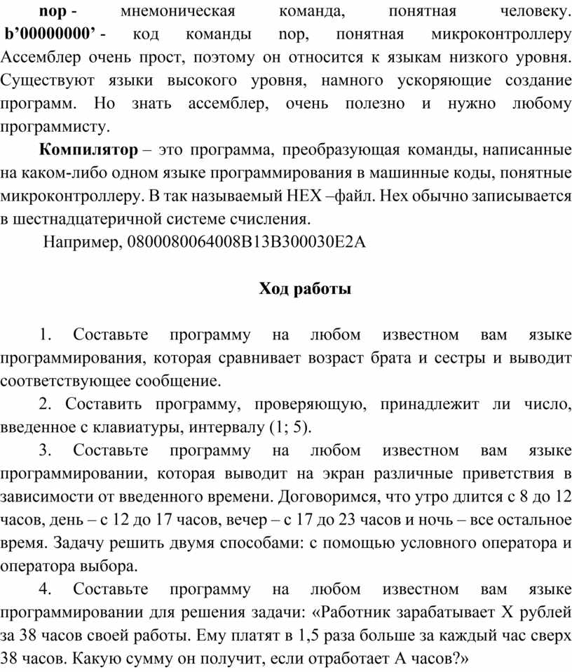 4. Составьте программу на любом известном вам языке программировании для решения задачи: «Работник зарабатывает X рублей за 38 часов своей работы. Ему платят в 1,5 раза больше за каждый час сверх 38 часов. Какую сумму он получит, если отработает A часов?»