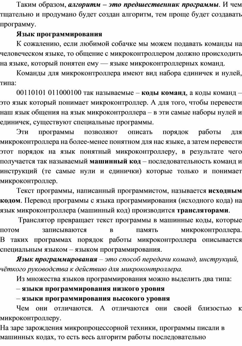 Текст программы, написанный программистом, называется исходным кодом. Перевод программы с языка программирования (исходного кода) на язык микроконтроллера (машинный код) производится трансляторами.