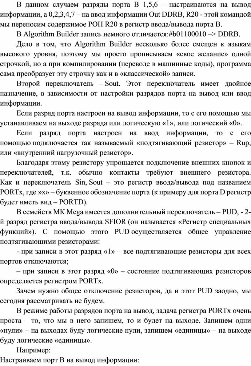 В данном случаем разряды порта В 1,5,6 – настраиваются на вывод информации, а 0,2,3,4,7 – на ввод информации Out DDRB, R20 - этой командой мы переносим содержимое РОН R20 в регистр ввода/вывода порта В.