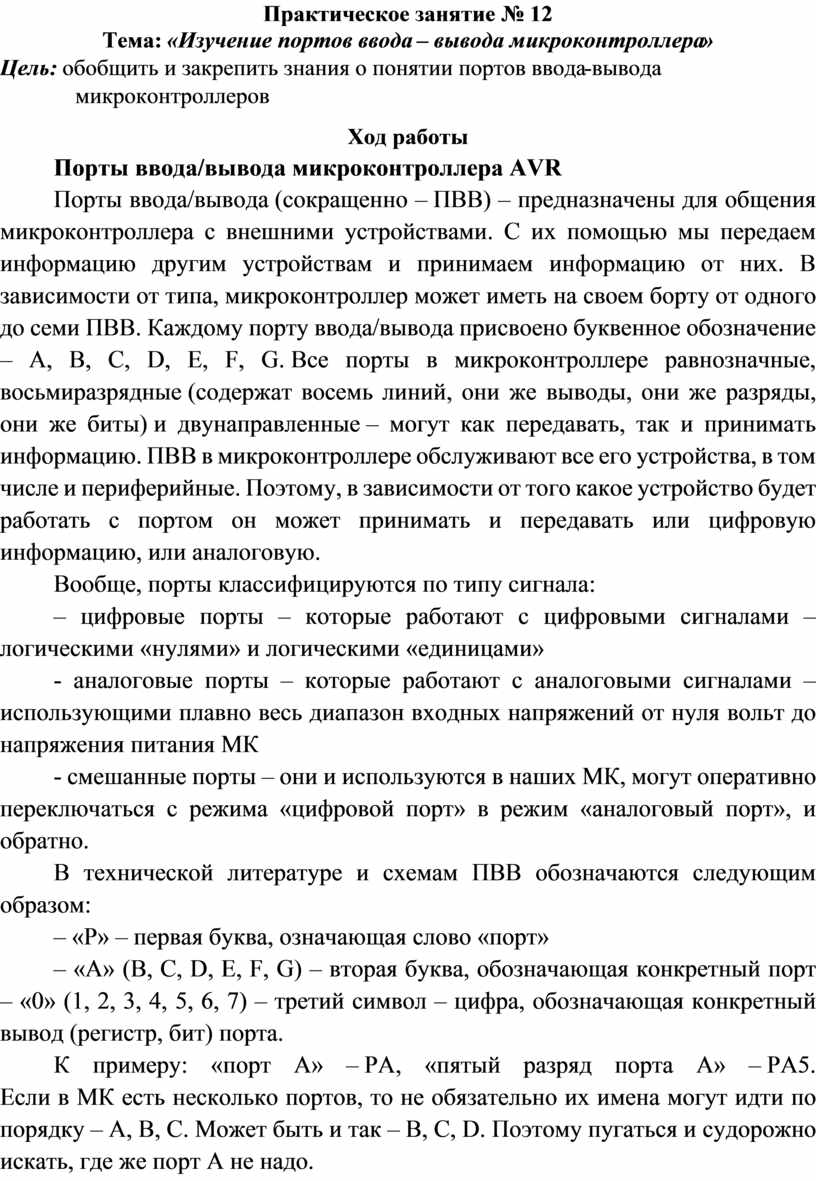 Порты ввода/вывода (сокращенно – ПВВ) – предназначены для общения микроконтроллера с внешними устройствами. С их помощью мы передаем информацию другим устройствам и принимаем информацию от них. В зависимости от типа, микроконтроллер может иметь на своем борту от одного до семи ПВВ. Каждому порту ввода/вывода присвоено буквенное обозначение – A, B, C, D, E, F, G. Все порты в микроконтроллере равнозначные, восьмиразрядные (содержат восемь линий, они же выводы, они же разряды, они же биты) и двунаправленные – могут как передавать, так и принимать информацию. ПВВ в микроконтроллере обслуживают все его устройства, в том числе и периферийные. Поэтому, в зависимости от того какое устройство будет работать с портом он может принимать и передавать или цифровую информацию, или аналоговую.