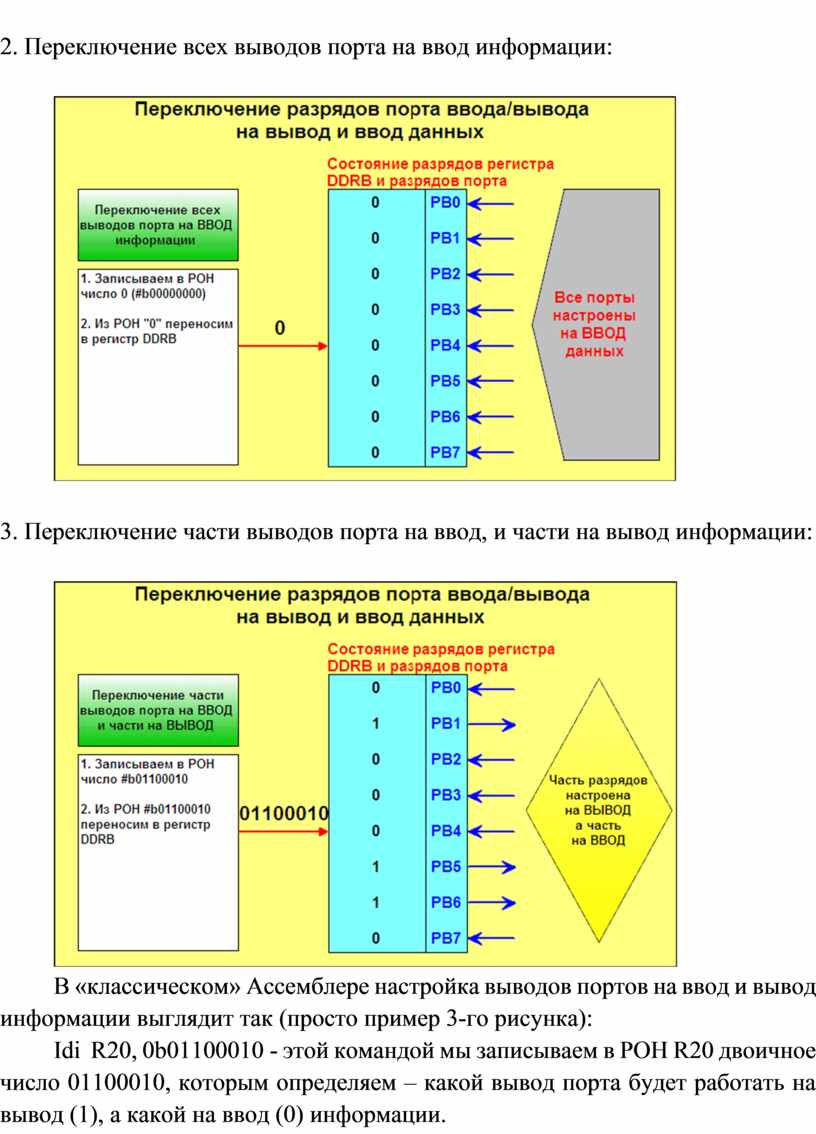В «классическом» Ассемблере настройка выводов портов на ввод и вывод информации выглядит так (просто пример 3-го рисунка):