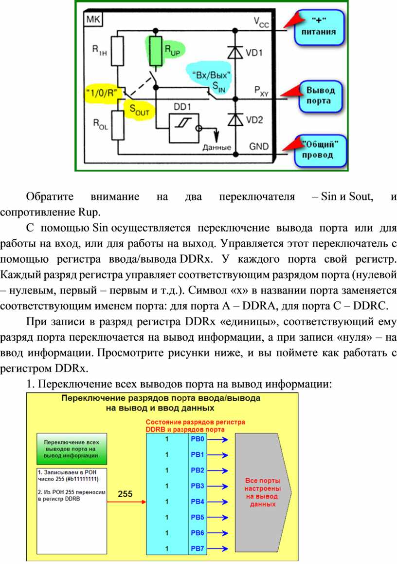 Для управления портами в их электрической схеме имеется два переключателя, которыми мы можем «щелкать» программно, используя специальные регистры ввода/вывода. Такие переключатели имеются для каждого вывода, что означает возможность управлять любым выводом порта. К примеру, один вывод порта можно настроить на ввод информации, три разряда этого же порта на вывод, а оставшиеся вообще не настраивать, оставить их в «Z- состоянии».