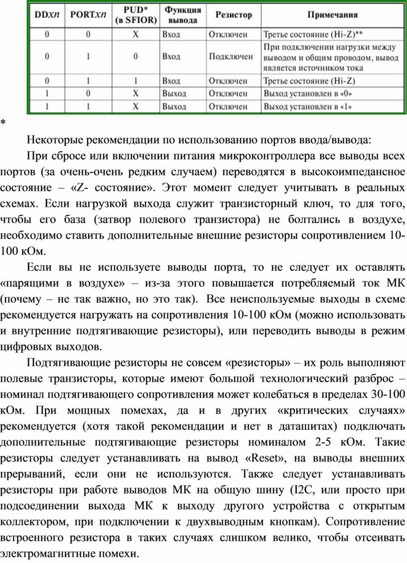 При сбросе или включении питания микроконтроллера все выводы всех портов (за очень-очень редким случаем) переводятся в высокоимпедансное состояние – «Z- состояние». Этот момент следует учитывать в реальных схемах. Если нагрузкой выхода служит транзисторный ключ, то для того, чтобы его база (затвор полевого транзистора) не болтались в воздухе, необходимо ставить дополнительные внешние резисторы сопротивлением 10-100 кОм.