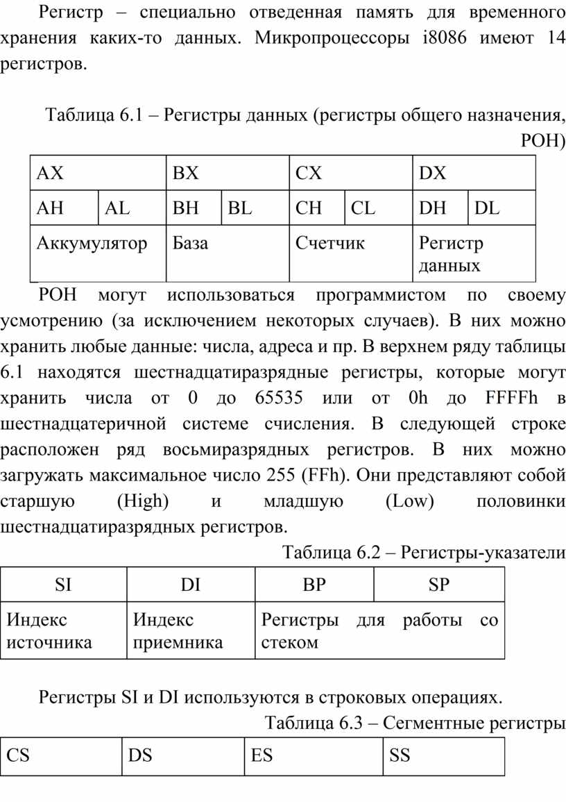 РОН могут использоваться программистом по своему усмотрению (за исключением некоторых случаев). В них можно хранить любые данные: числа, адреса и пр. В верхнем ряду таблицы 6.1 находятся шестнадцатиразрядные регистры, которые могут хранить числа от 0 до 65535 или от 0h до FFFFh в шестнадцатеричной системе счисления. В следующей строке расположен ряд восьмиразрядных регистров. В них можно загружать максимальное число 255 (FFh). Они представляют собой старшую (High) и младшую (Low) половинки шестнадцатиразрядных регистров.
