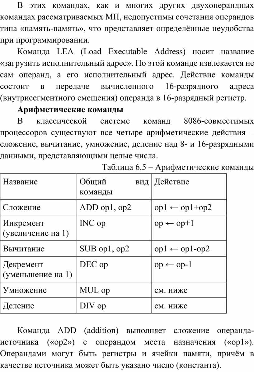 Команда LEA (Load Executable Address) носит название «загрузить исполнительный адрес». По этой команде извлекается не сам операнд, а его исполнительный адрес. Действие команды состоит в передаче вычисленного 16-разрядного адреса (внутрисегментного смещения) операнда в 16-разрядный регистр.