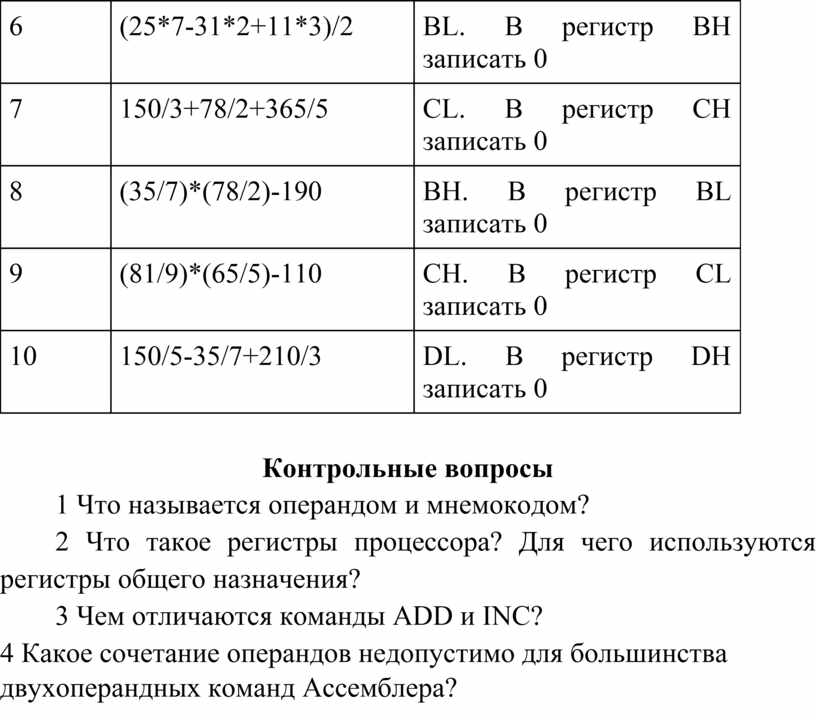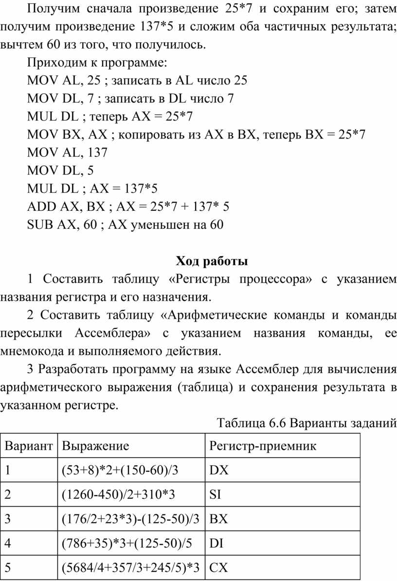 3 Разработать программу на языке Ассемблер для вычисления арифметического выражения (таблица) и сохранения результата в указанном регистре.