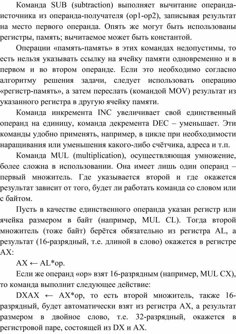 Операции «память-память» в этих командах недопустимы, то есть нельзя указывать ссылку на ячейку памяти одновременно и в первом и во втором операнде. Если это необходимо согласно алгоритму решения задачи, следует использовать операцию «регистр-память», а затем переслать (командой MOV) результат из указанного регистра в другую ячейку памяти.