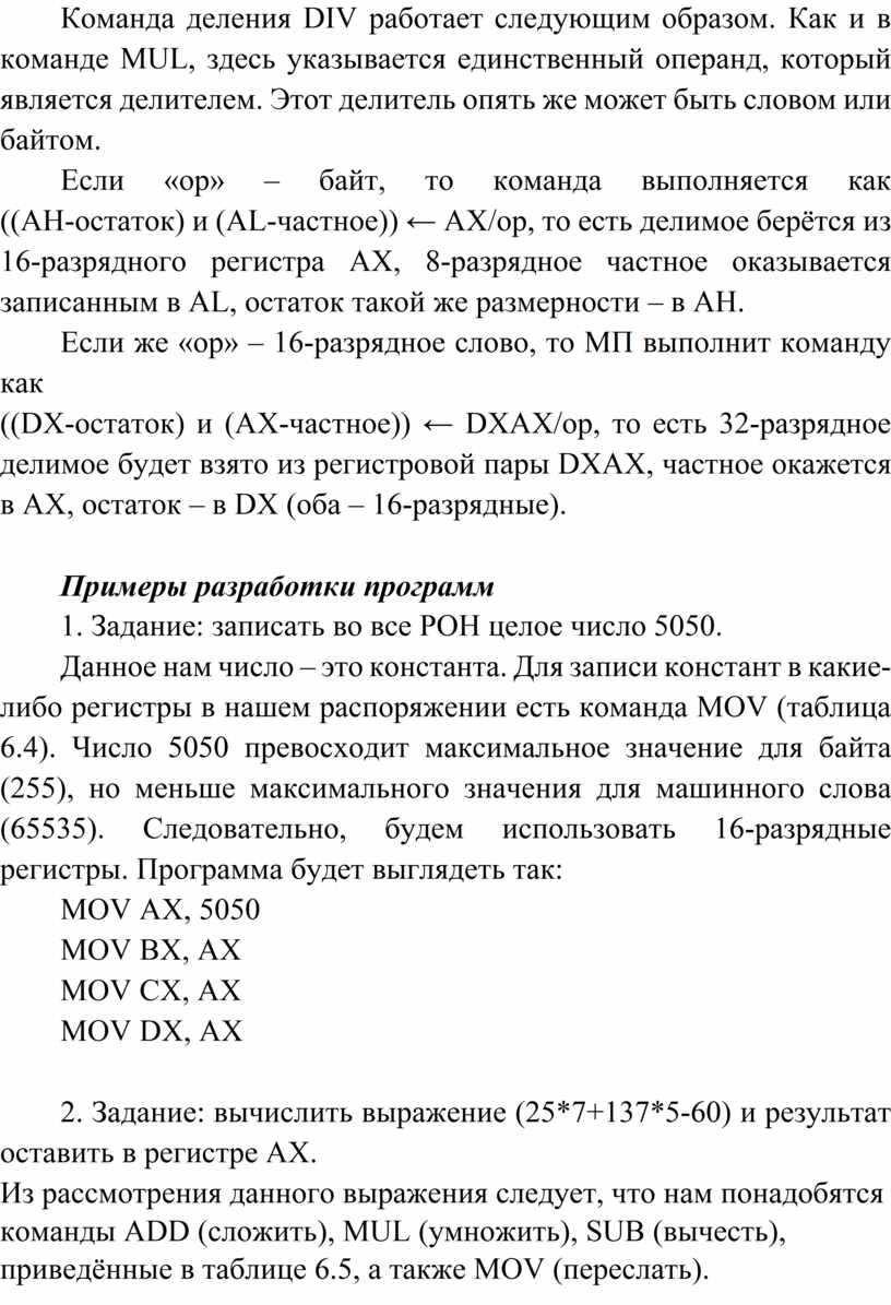 Команда деления DIV работает следующим образом. Как и в команде MUL, здесь указывается единственный операнд, который является делителем. Этот делитель опять же может быть словом или байтом.
