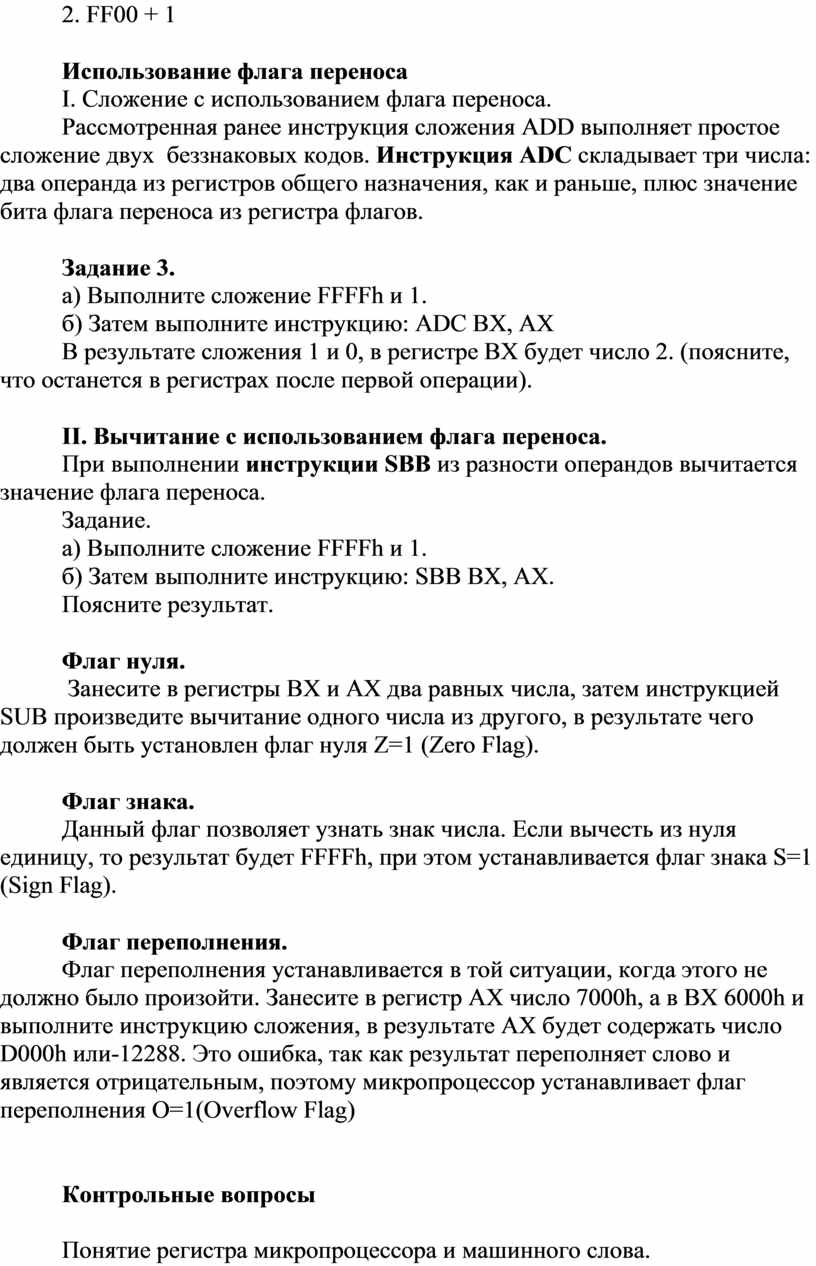 Выполните сложение чисел FFFFh (AX) и 1h (BX). Каков результат операции?