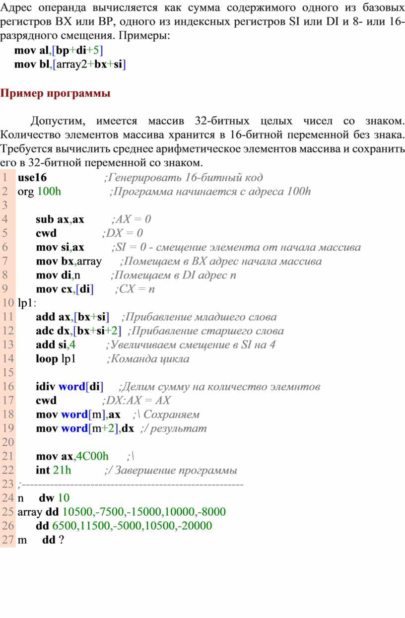 Адрес операнда вычисляется как сумма содержимого одного из базовых регистров BX или BP, одного из индексных регистров SI или DI и 8- или 16-разрядного смещения. Примеры: