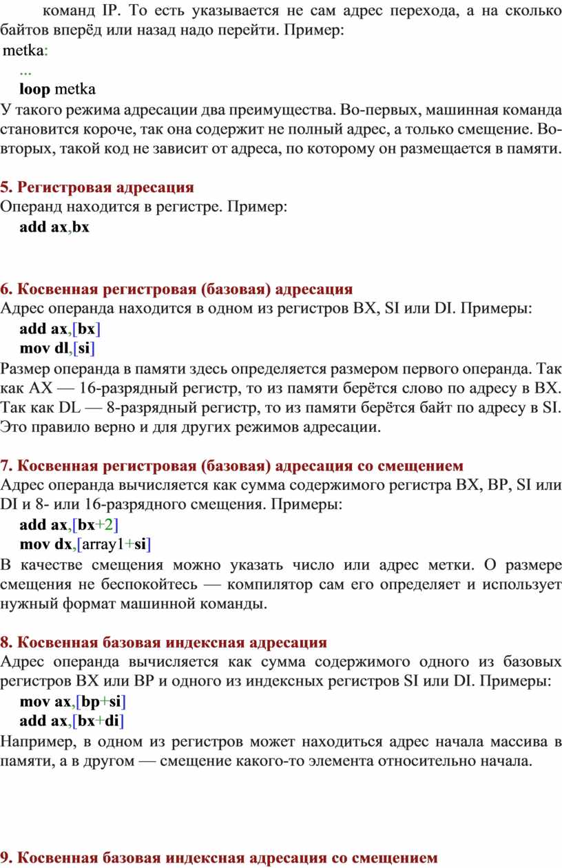 У такого режима адресации два преимущества. Во-первых, машинная команда становится короче, так она содержит не полный адрес, а только смещение. Во-вторых, такой код не зависит от адреса, по которому он размещается в памяти.