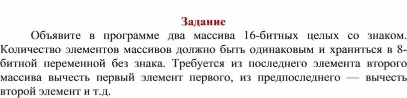 Объявите в программе два массива 16-битных целых со знаком. Количество элементов массивов должно быть одинаковым и храниться в 8-битной переменной без знака. Требуется из последнего элемента второго массива вычесть первый элемент первого, из предпоследнего — вычесть второй элемент и т.д.