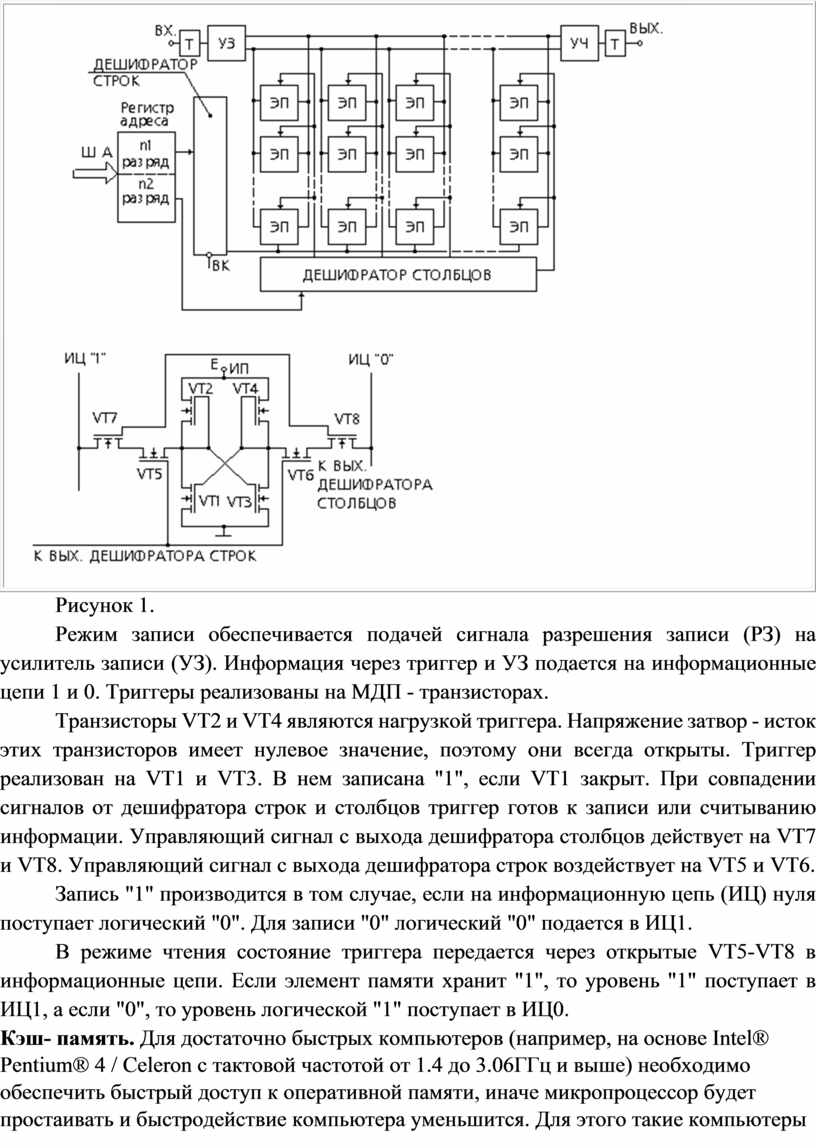 В режиме чтения состояние триггера передается через открытые VT5-VT8 в информационные цепи. Если элемент памяти хранит "1", то уровень "1" поступает в ИЦ1, а если "0", то уровень логической "1" поступает в ИЦ0.