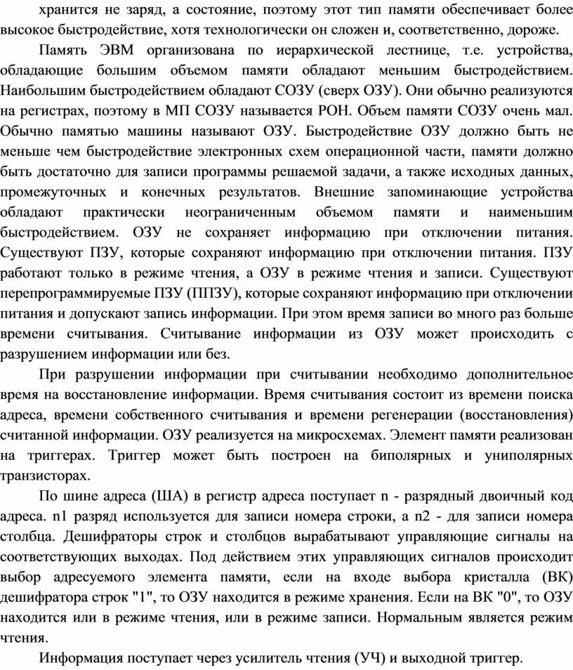 Память ЭВМ организована по иерархической лестнице, т.е. устройства, обладающие большим объемом памяти обладают меньшим быстродействием. Наибольшим быстродействием обладают СОЗУ (сверх ОЗУ). Они обычно реализуются на регистрах, поэтому в МП СОЗУ называется РОН. Объем памяти СОЗУ очень мал. Обычно памятью машины называют ОЗУ. Быстродействие ОЗУ должно быть не меньше чем быстродействие электронных схем операционной части, памяти должно быть достаточно для записи программы решаемой задачи, а также исходных данных, промежуточных и конечных результатов. Внешние запоминающие устройства обладают практически неограниченным объемом памяти и наименьшим быстродействием. ОЗУ не сохраняет информацию при отключении питания. Существуют ПЗУ, которые сохраняют информацию при отключении питания. ПЗУ работают только в режиме чтения, а ОЗУ в режиме чтения и записи. Существуют перепрограммируемые ПЗУ (ППЗУ), которые сохраняют информацию при отключении питания и допускают запись информации. При этом время записи во много раз больше времени считывания. Считывание информации из ОЗУ может происходить с разрушением информации или без.