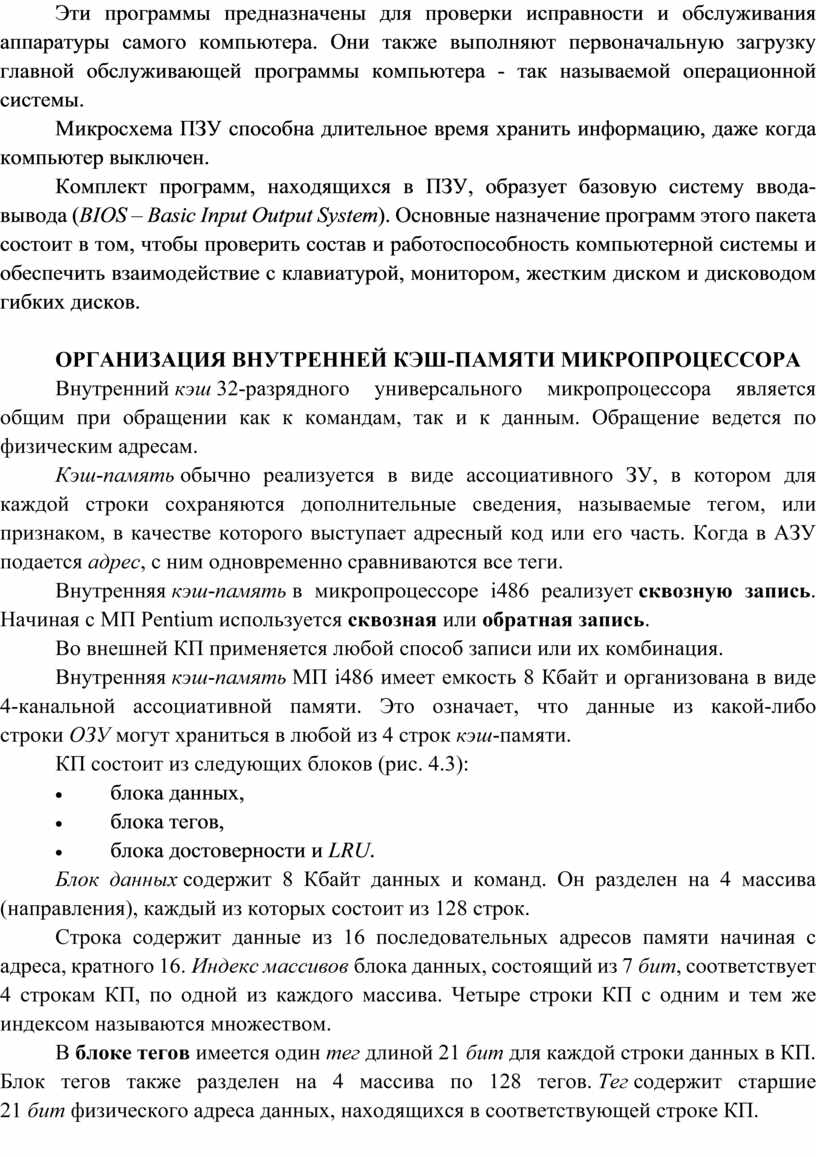 Внутренняя кэш-память МП i486 имеет емкость 8 Кбайт и организована в виде 4-канальной ассоциативной памяти. Это означает, что данные из какой-либо строки ОЗУ могут храниться в любой из 4 строк кэш-памяти.